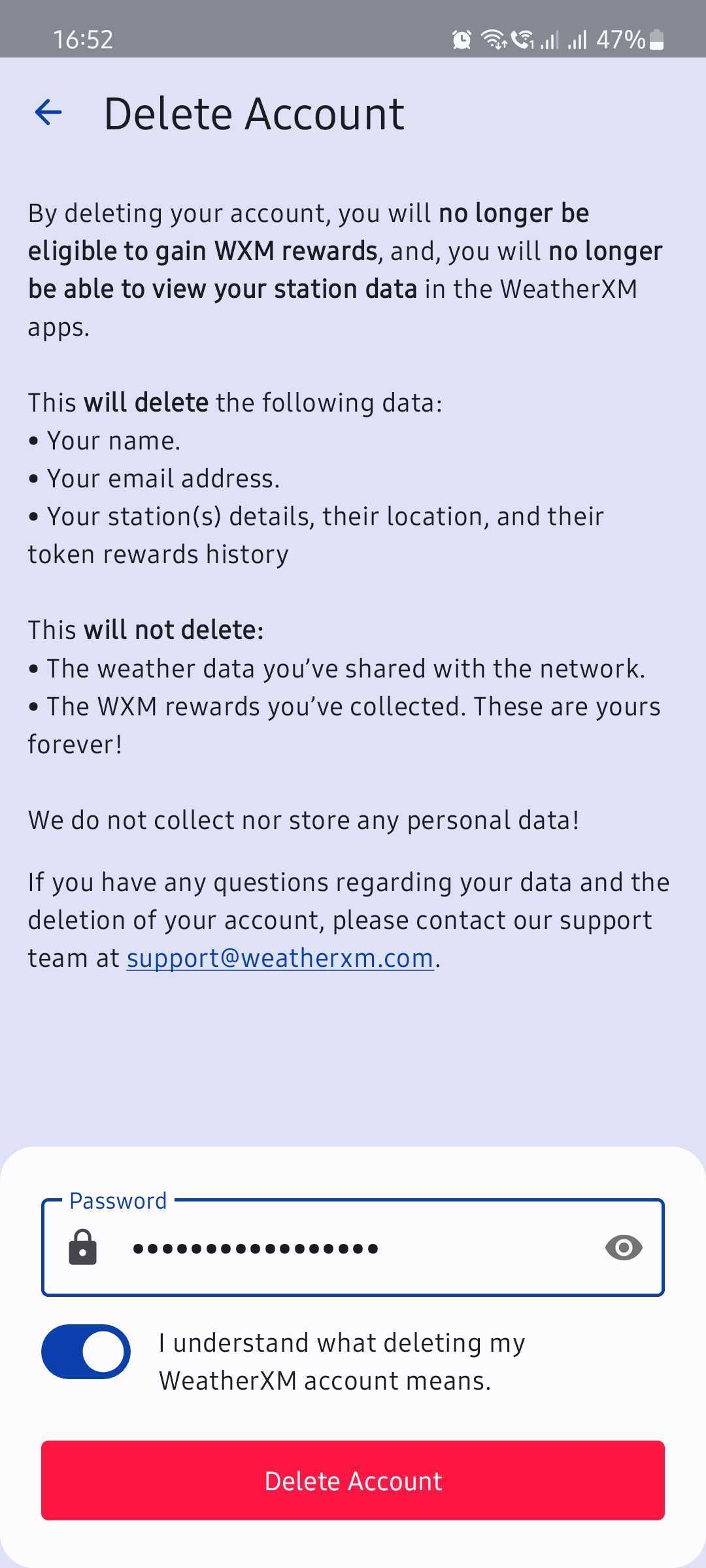 By deleting your account, you will no longer be eligible to gain WXM rewards, and you will no longer be able to view your station data in the WeatherXM apps.