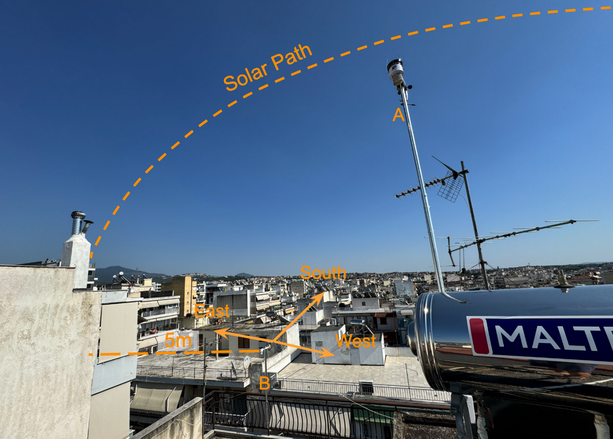 We installed two weather stations on a rooftop to investigate how nearby walls and other obstacles might affect weather measurements. One station, our reference station (considered the reliable installation, see Figure 1, Station A - WS1000), was placed at the highest point of the roof, where there were no obstacles taller than the station that could interfere with its readings. The second station, the “obstructed” installation in our experiment (see Figure 1, Station B - WS1001), was placed in a location (see Figure 3) where: