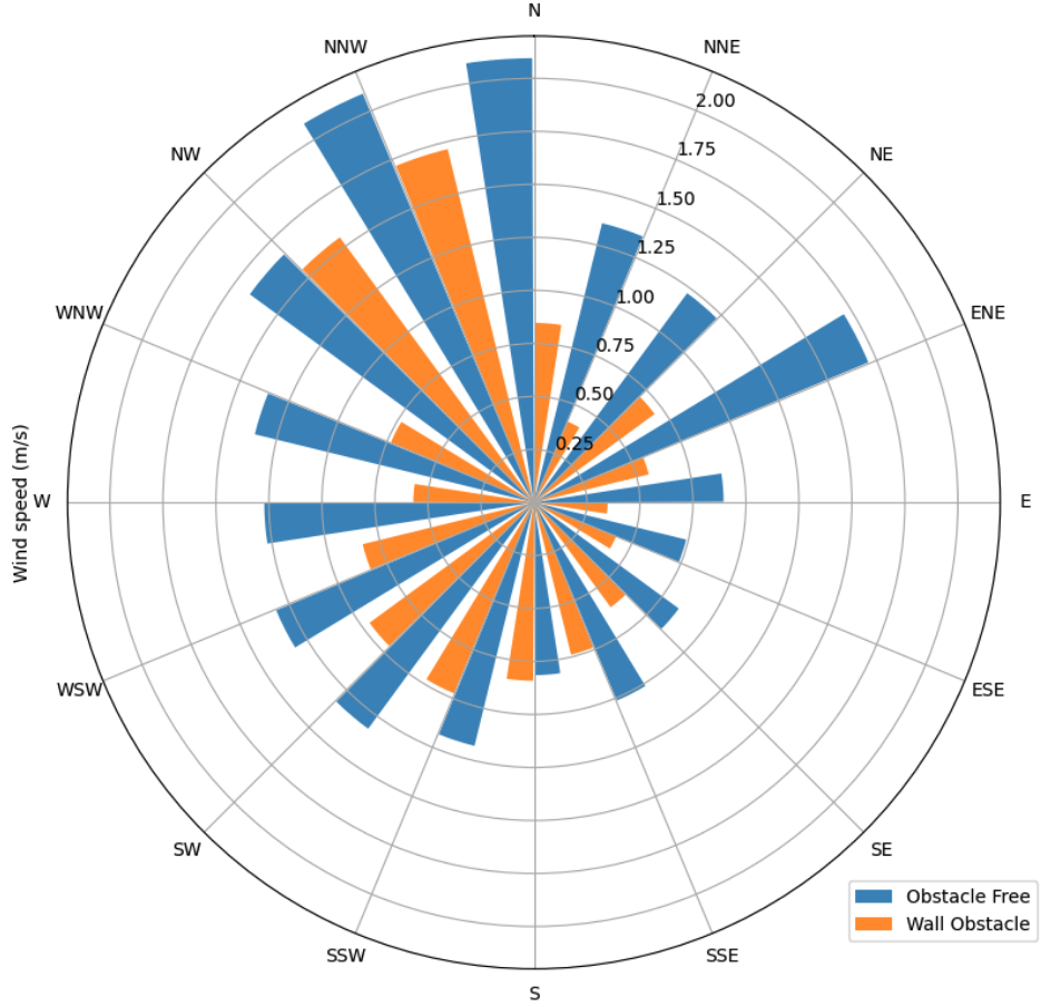- In the east-southeast directions, wind speed at Station B tends to recover slightly but still remains lower. This is likely because the wall continues to have some influence on the overall air circulation and flow. Additionally, when winds are from the east, their actual direction may fluctuate between NE and SE, but the measured speed remains reduced due to friction with obstacles and because both wind speed and direction have been averaged over one-minute intervals.